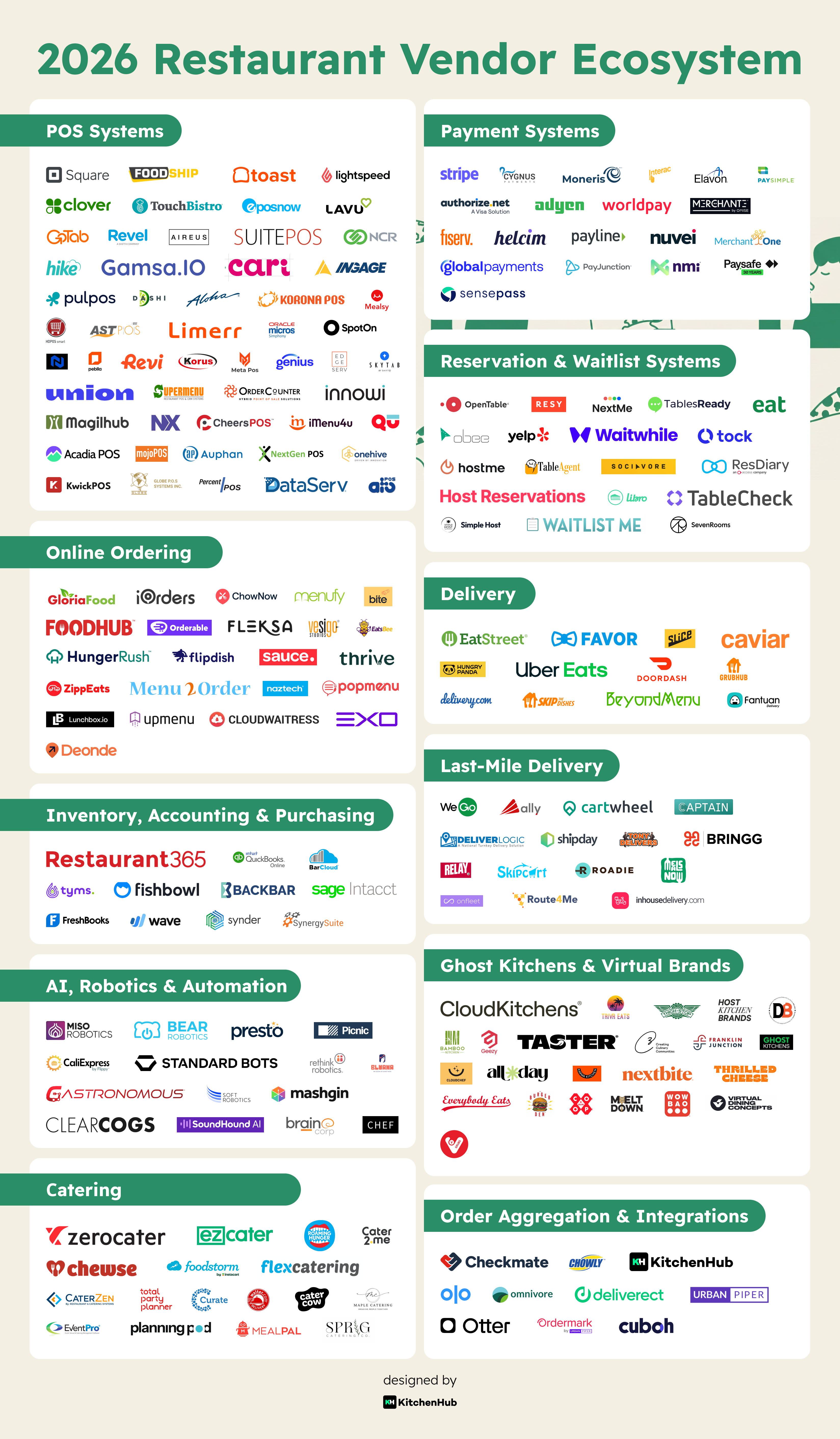 Some products span multiple layers, but to keep the restaurant tech market map readable, we generally list each company in the category that reflects its primary value.